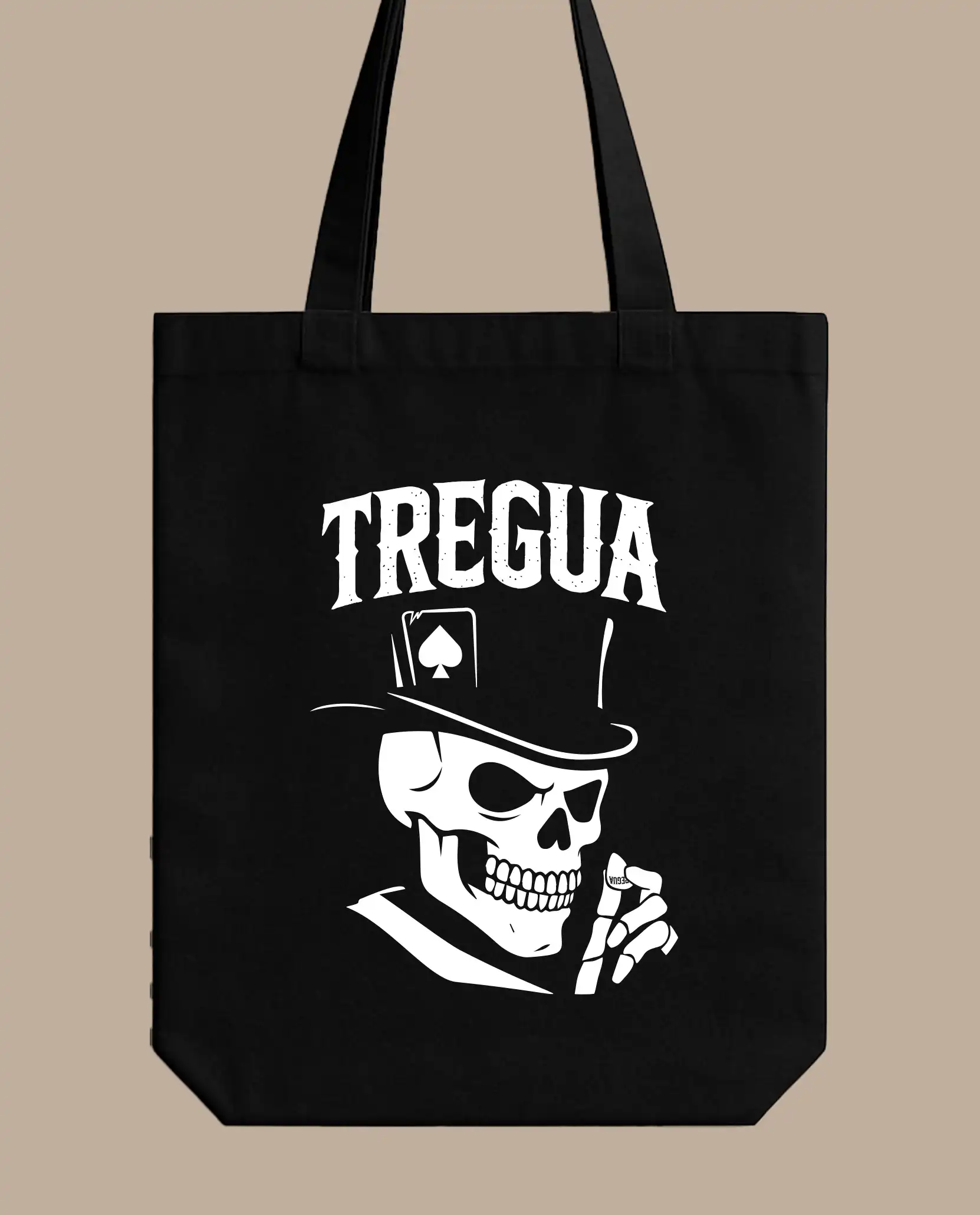 Tote bag negra de asa larga 100% algodón, 140gr, 38×42 cm diseño exclusivo modelo “Calavera” de la colección “Treguarock”. ¡Hazte con ella!